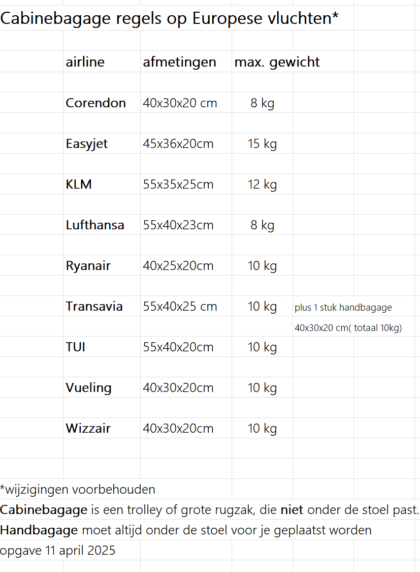 Steeds meer airlines hebben het besluit genomen de handbagage regels aan te passen om de vaak ontstane chaos aan boord te kunnen voorkomen. Dat geeft gedoe en vertragingen. Ook wordt standaard door passagiers te veel (hand) bagage aan boord meegenomen om bij aankomst niet te hoeven wachten op de ingecheckte koffers. Deze beperkingen van de handbagage worden hieronder in een overzicht van de meest bekende en gebruikte airlines weer gegeven. De nieuwe handbagagenorm is de 40x30x20 cm tas. LET OP: Airlines vertrekkend vanuit Duitse luchthavens hanteren vaak andere regels.