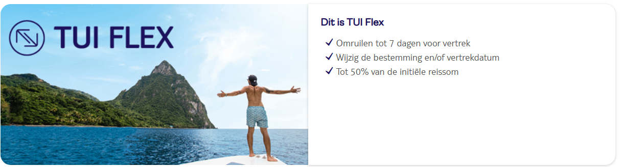 Boek je een zonvakantie of verre reis dan is omruilen met TUI Flex mogelijk, mits het om een vooraf georganiseerde pakketreis gaat en de vluchten worden uitgevoerd door TUI fly.